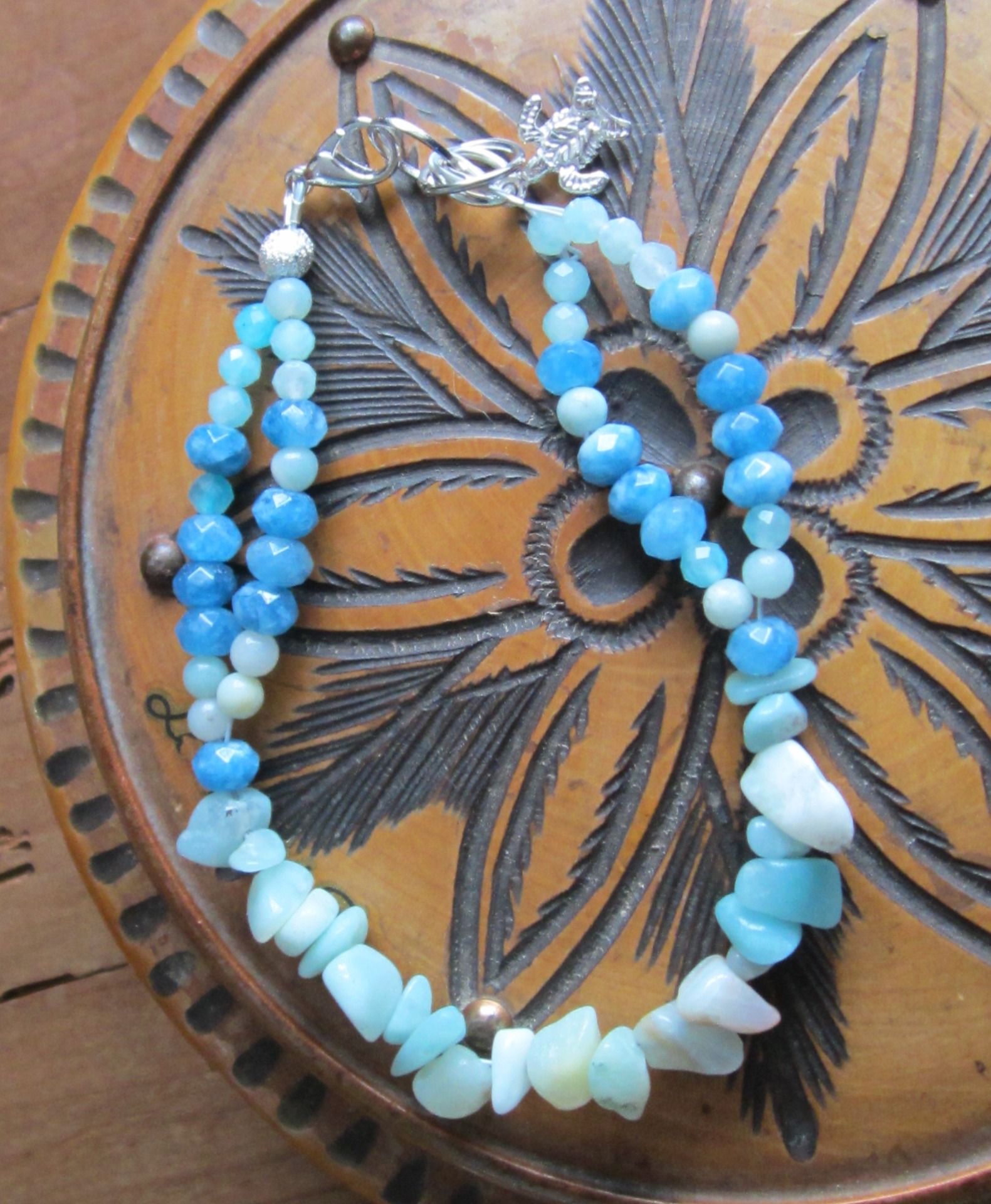 Bracelet en perles naturelles Amazonite montées sur fil câblé. Perles rondes, perles facettées et perles chips. Breloque tortue 14 mm en argent 925 Longueur: 21 à 22 cm