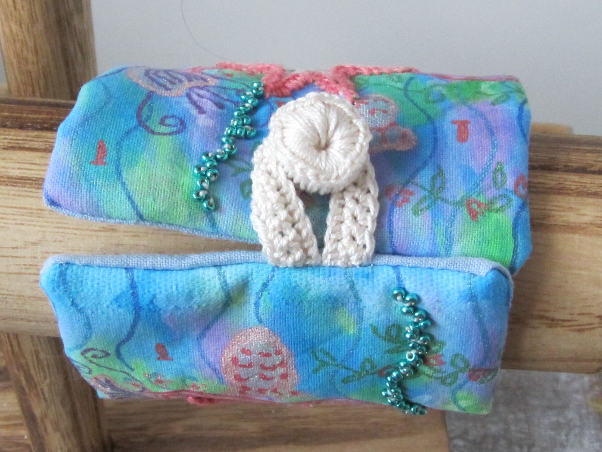 Bracelet en tissu, fait main, doublé et légèrement matelassé pour plus de confort. Peinture et détails au feutre textile, appliqués et perles brodés à la main, chaque pièce est unique. Fermeture par bouton et boutonnière faits au crochet.