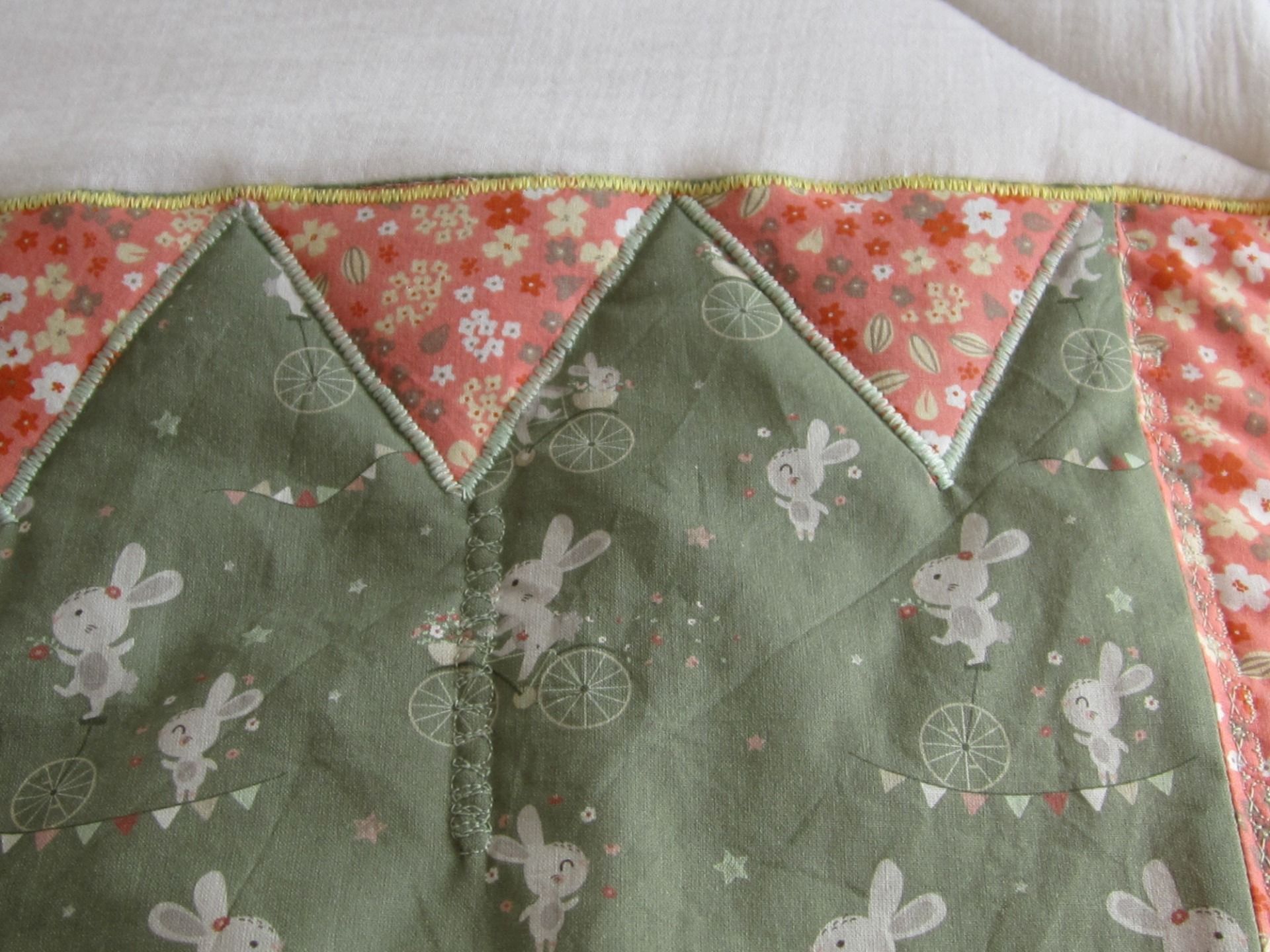 Une couverture mi-saison, alliant la douceur de la double gaze et la mignonnerie d'un coton vert sauge avec un motif délicat de petits lapins à vélo, quelques fleurs et guirlandes aux couleurs douces. Une bande de coton fleuri rose/pêche ainsi que des appliqués coeur et guirlande de triangles donnent du caractère et de la gaieté à cette couverture.