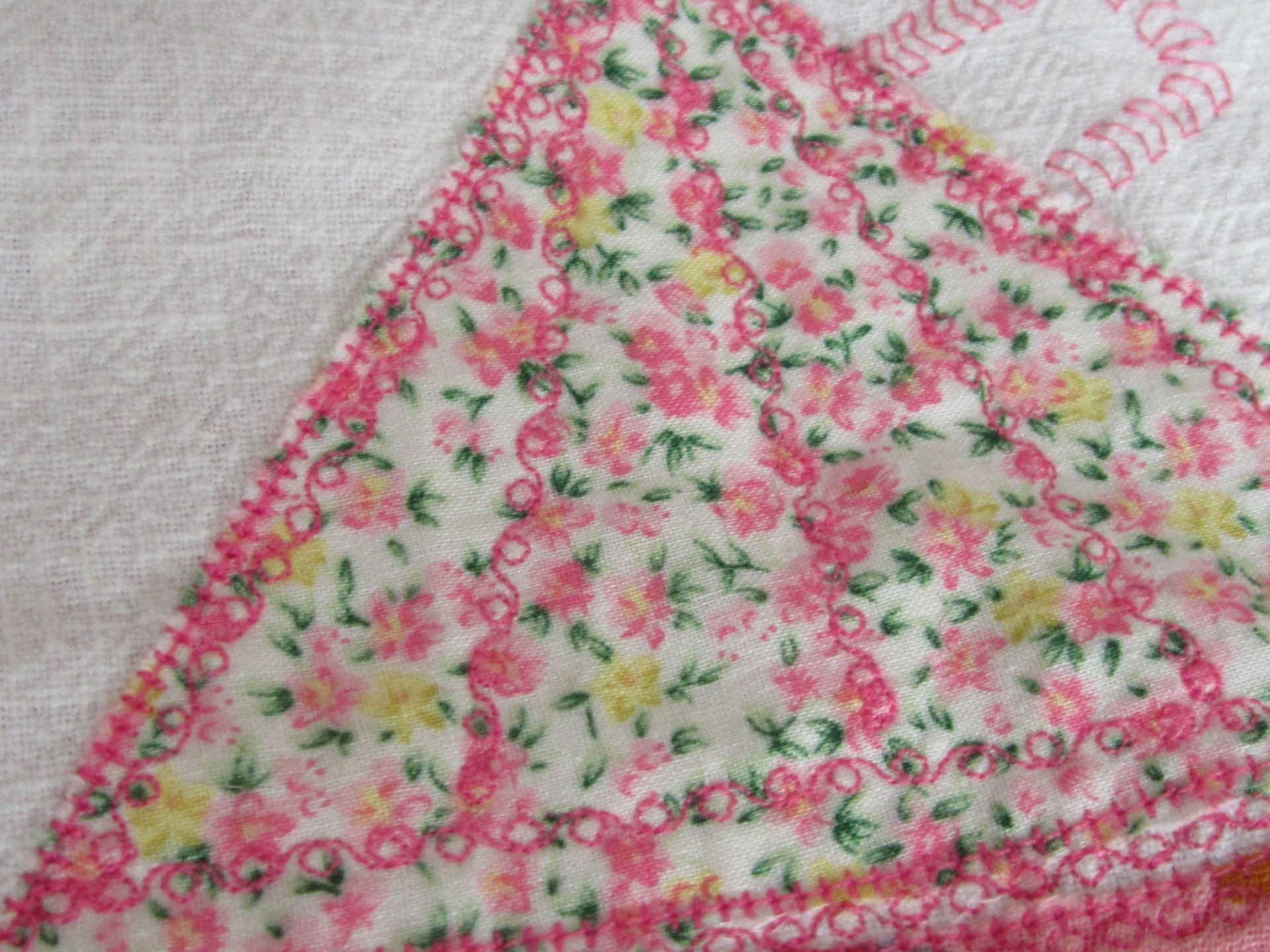 Couverture mi-saison, artisanale en lin lavé écru et double gaze fleurie rose, ouatine légère (100g/ m2). Des tissus tout doux pour une couverture au modèle unique. 104 x 88 cm