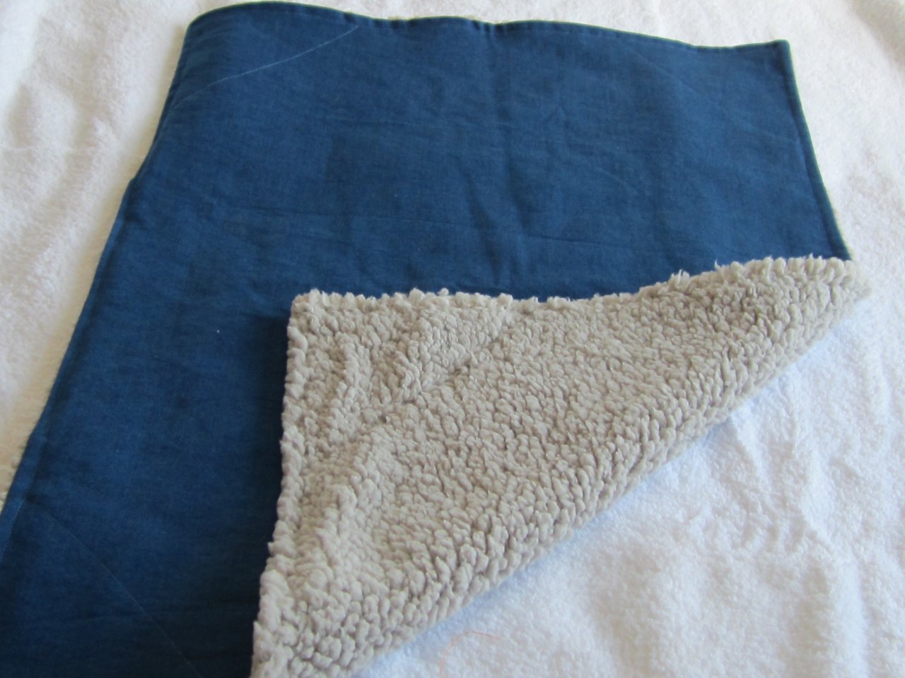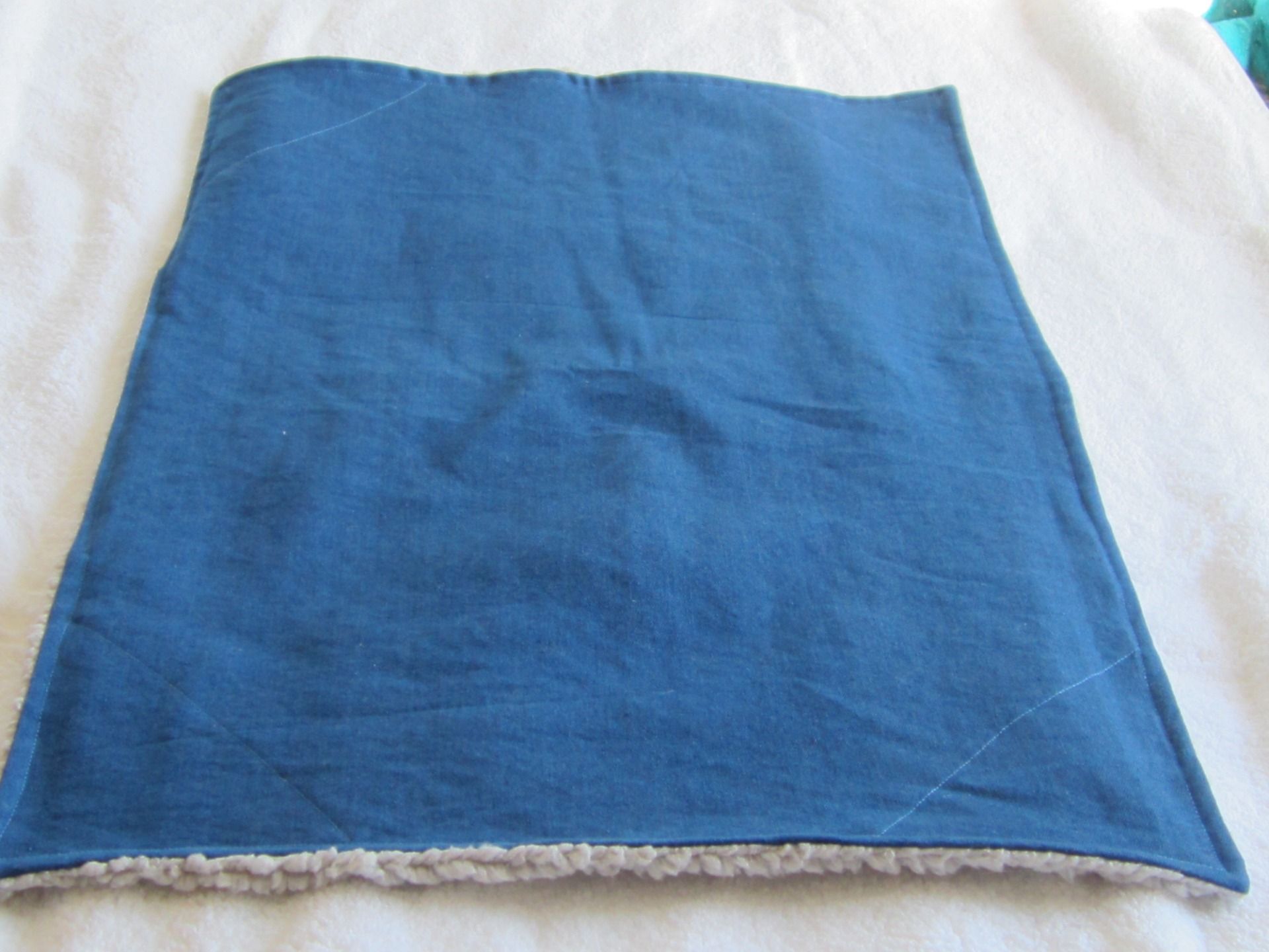 Couverture artisanale réversible en jean et sherpa doux, idéale pour chat et petit chien. Souple et confortable, parfaite pour le panier, le canapé ou les déplacements