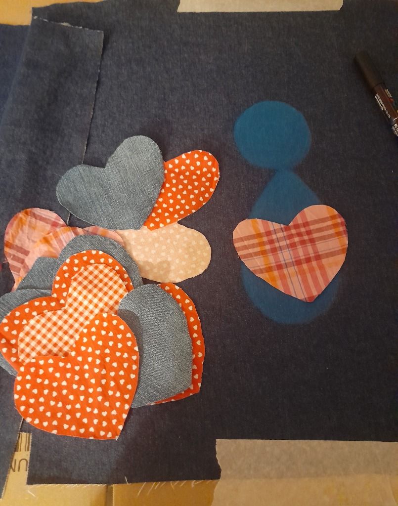 Un nouveau sac en cours. Des essais, des cœurs rouges, roses mais peut-être que je vais choisir du bleu...
