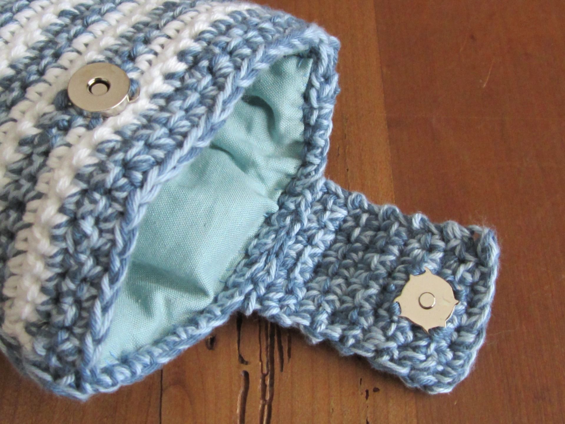 Etui à lunettes fait main au crochet en 100% coton Okeo-Tex, matelassé et doublé à la main en tissu 100% coton. Rayures banches et bleu chiné, style marin. Fermeture avec un bouton magnétique. Longueur: 19cm; largeur: 12 cm; épaisseur: 4 cm. Poids: 92g