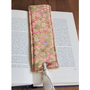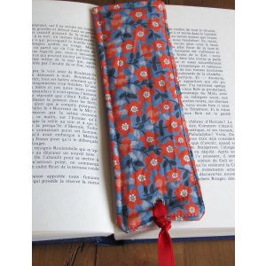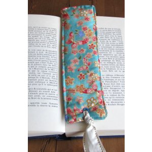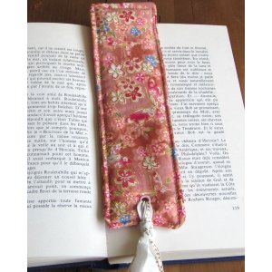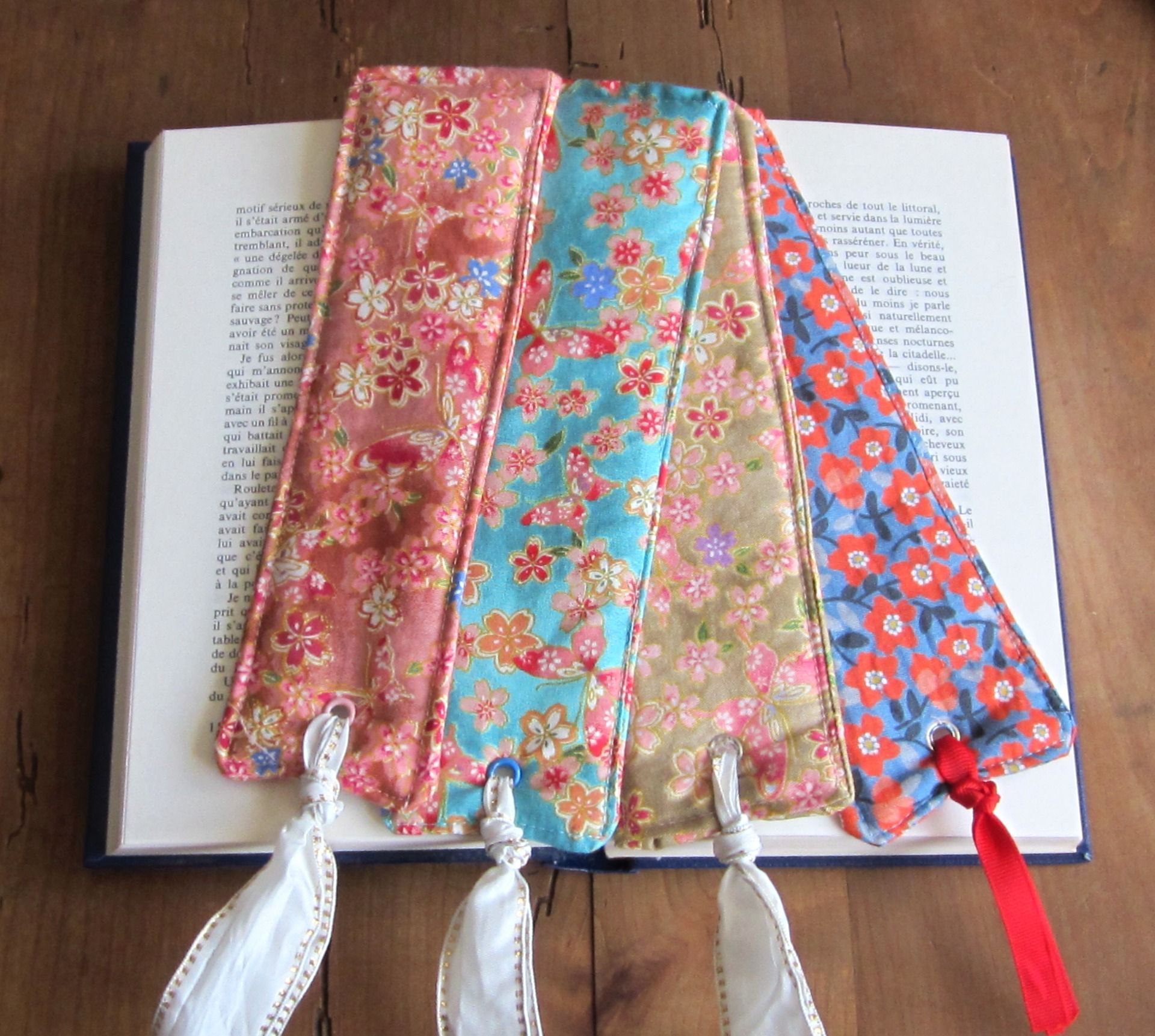Chaque marque-page est fait main en tissu 100% coton matelassé avec de la ouratine, décoré avec un oeillet métal dans lequel est passé un ruban.