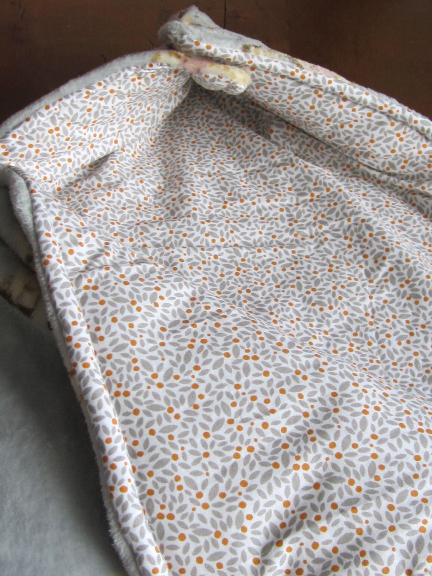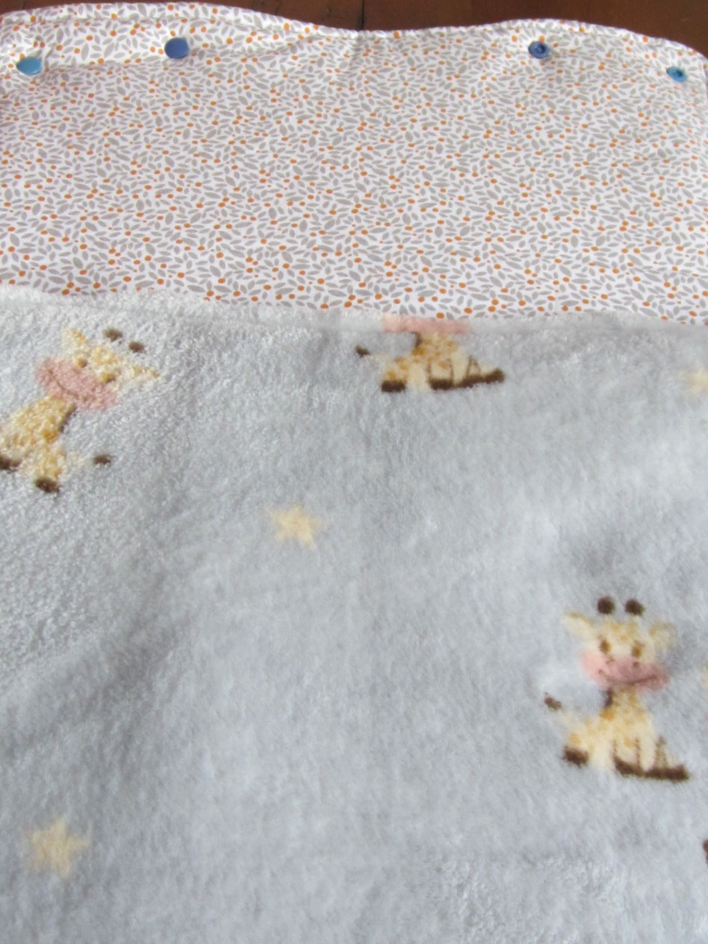 - Nid d'ange avec polaire gris bleuté à motif girafes et tissu coton blanc à motif gris et orange. Boutons pression bleu canard et bleu foncé
