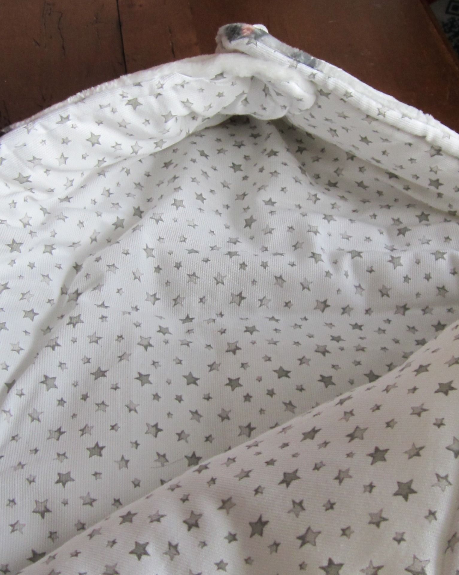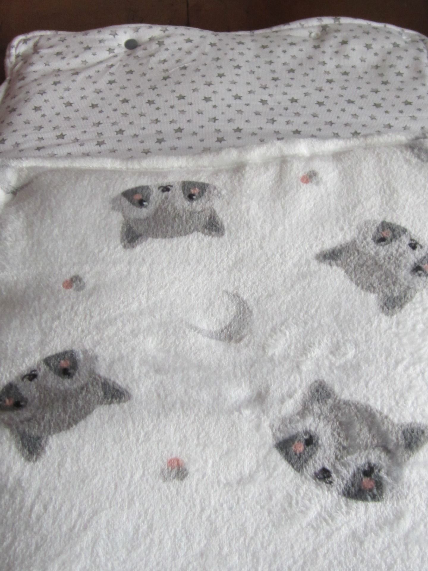 - Nid d'ange avec polaire blanc à motif ratons laveur et tissu coton blanc avec des étoiles grises. Boutons pression en résine blanc et gris