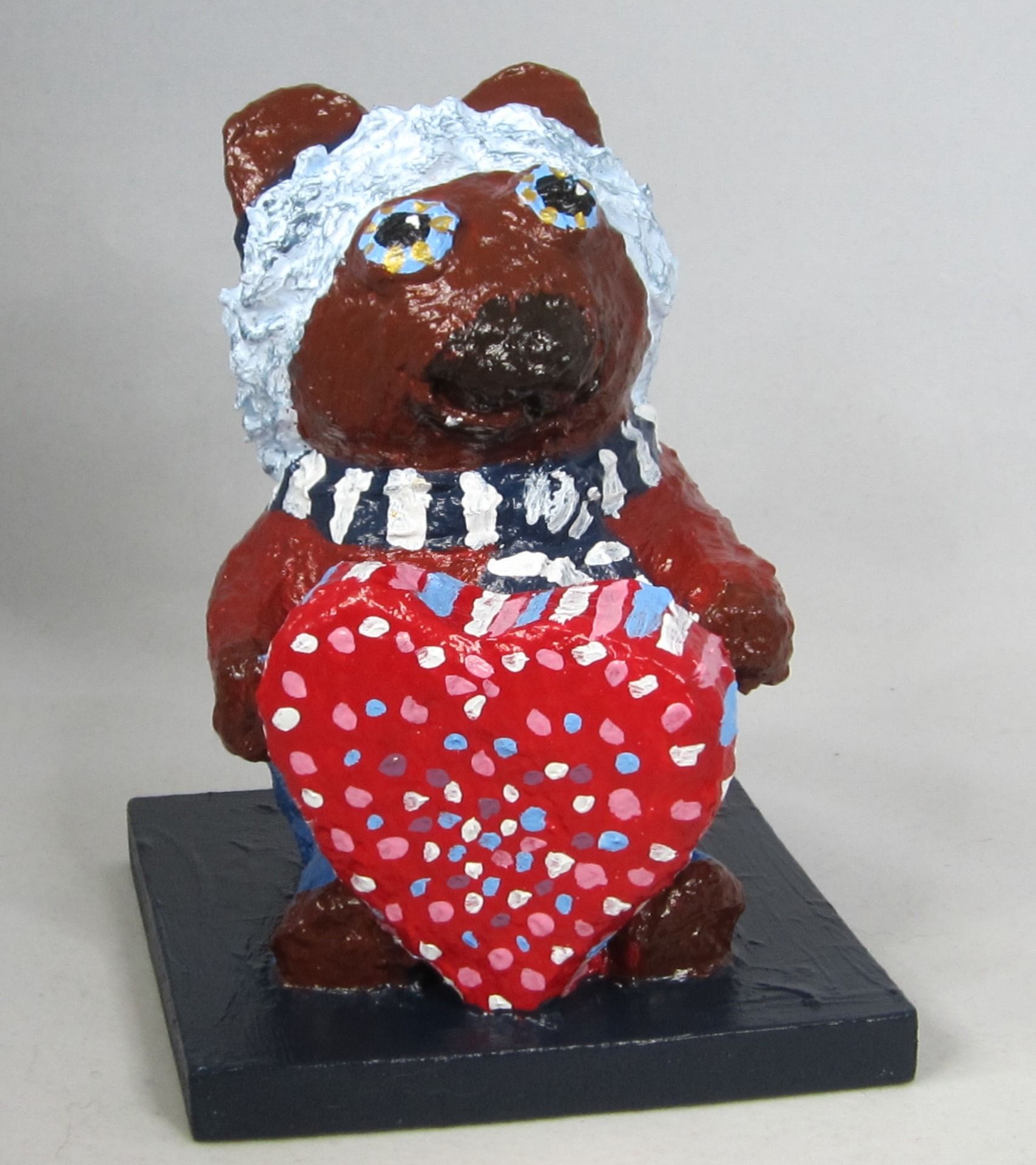 Petits ours faits main en pâte à papier, peints à l'acrylique puis vernis. VENDUS à L'UNITE, chaque ours est un modèle unique. Noël (avec cadeau) et Sylvestre (cœur) sont à offrir ou à s'offrir. H 13, P 10, l 9,5 cm, P 204g +/-