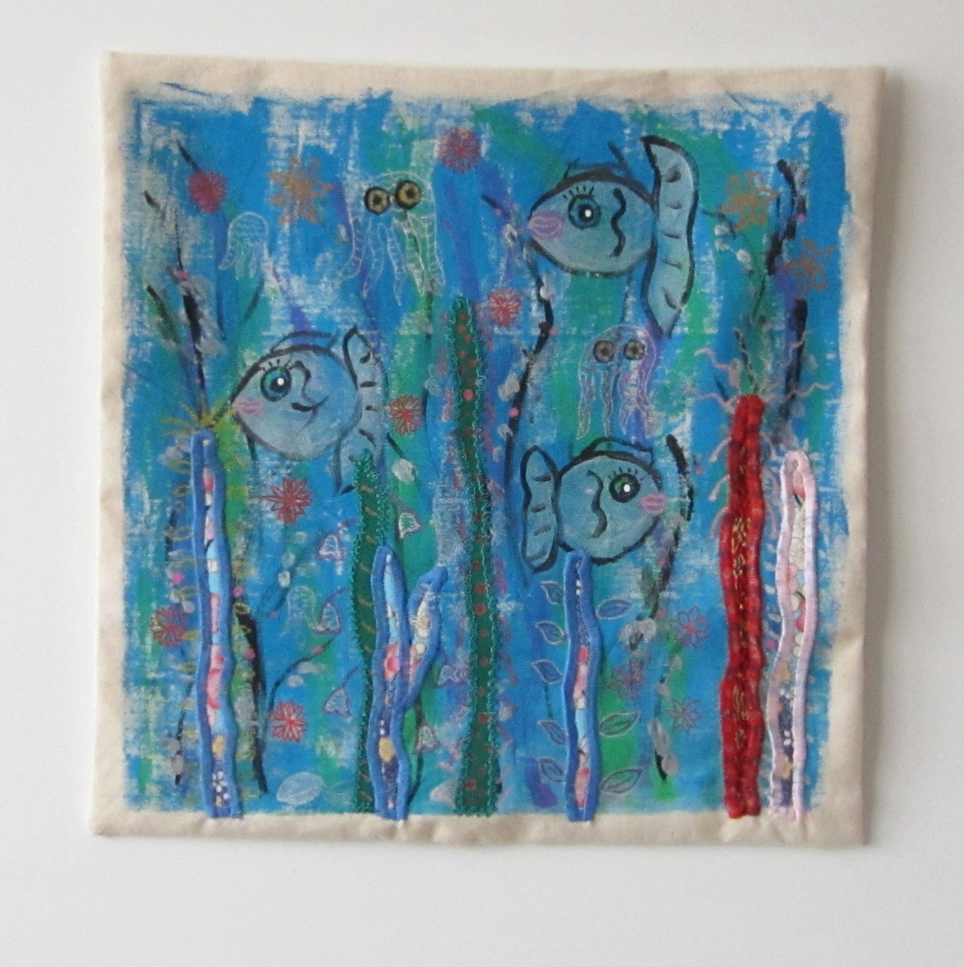 Toile textile réalisée lentement, de façon intuitive. Un jeu de couleurs évoquant les profondeurs sous-marines est enrichi par la couture d'appliqués en tissu, cousus machines, et de détails aux feutres textiles..