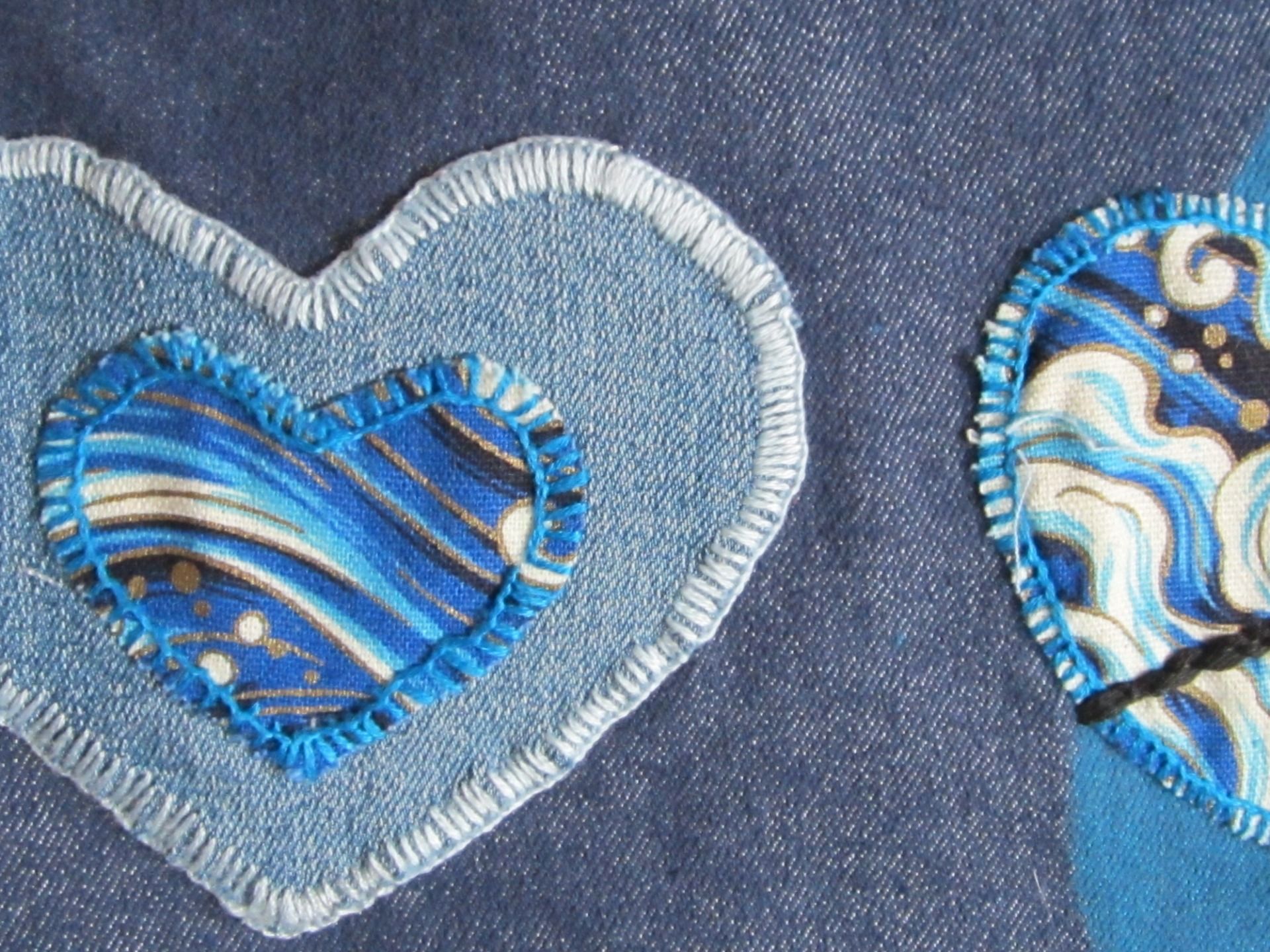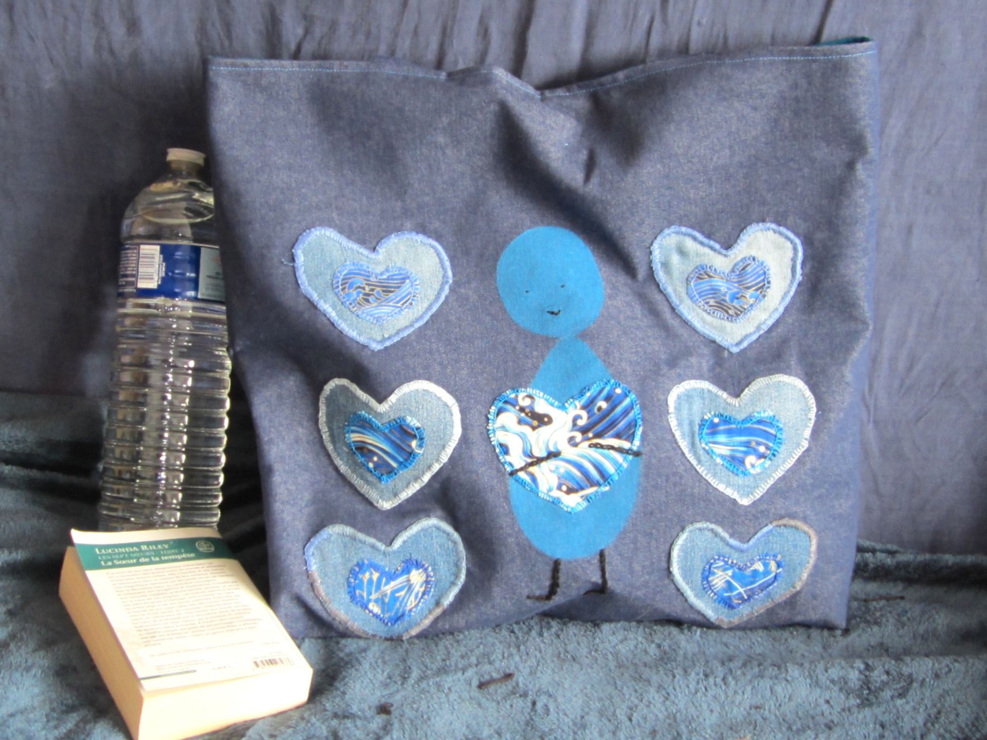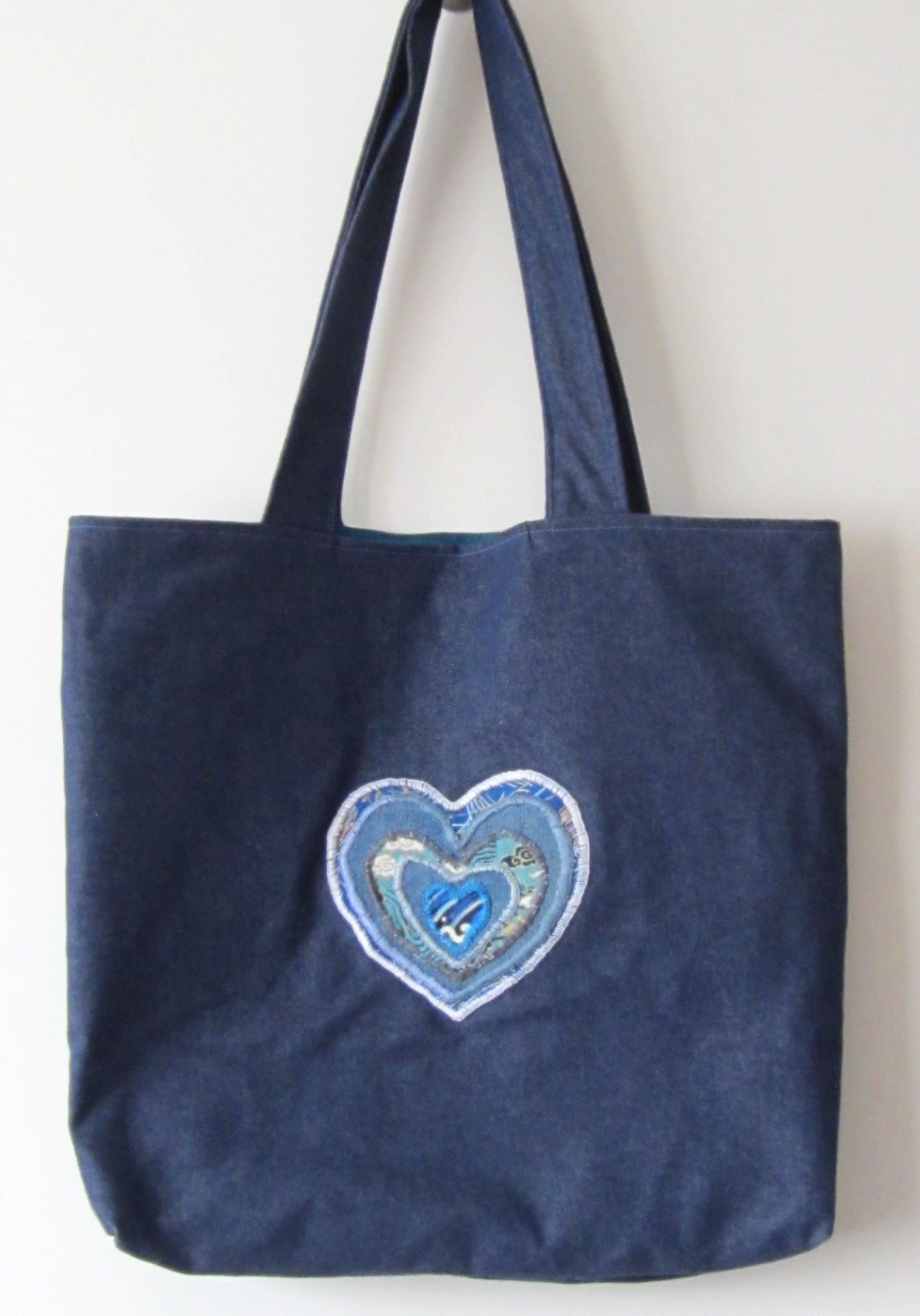 sac textile "Cœurs indigos" - peint à la main et appliqués brodés